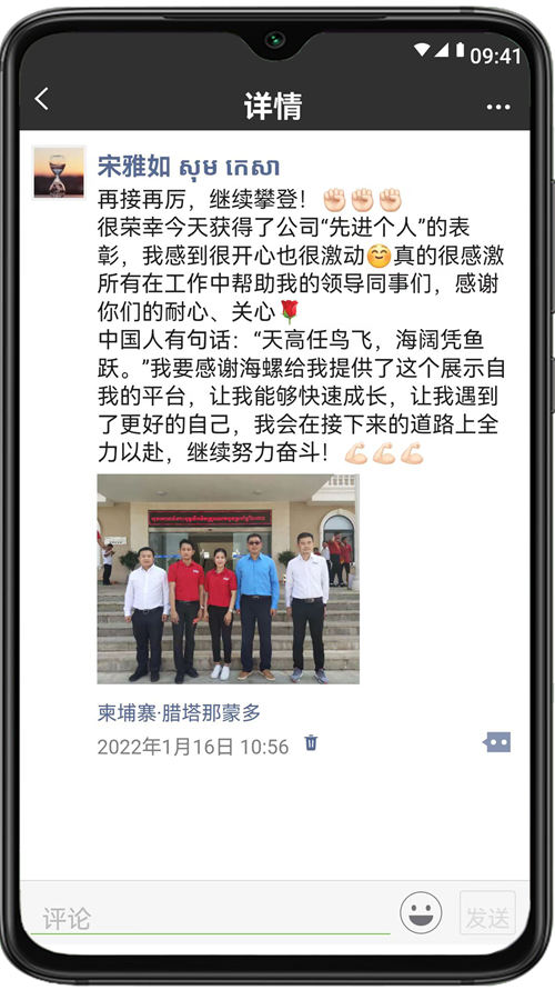 ??? ????(中文名:宋雅如),2017年進(jìn)入柬埔寨馬德望海螺,曾獲海螺集團(tuán)“2021年度先進(jìn)工作者”榮譽(yù)稱號(hào),現(xiàn)任馬德望海螺生產(chǎn)品質(zhì)處處長(zhǎng)助理。