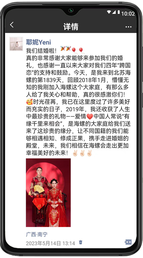 Yeni(中文名:耶妮),2018年1月加入北蘇海螺,現(xiàn)擔(dān)任北蘇海螺生產(chǎn)品質(zhì)處生產(chǎn)統(tǒng)計(jì)員兼翻譯,2019年與中國(guó)員工張鐳寶相識(shí)相戀,2023年,二人喜結(jié)連理,成為海螺大家庭里的“跨國(guó)夫妻”。