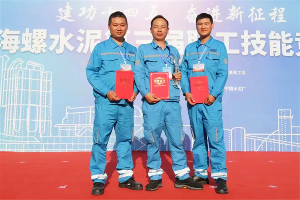 一等獎(jiǎng)獲得者(從左至右):廣元海螺李吉國(guó)(焊工)、寧國(guó)廠劉文文(電工)、荻港海螺陳湯姆(鉗工)、寧國(guó)廠張劉(水泥操作工)。