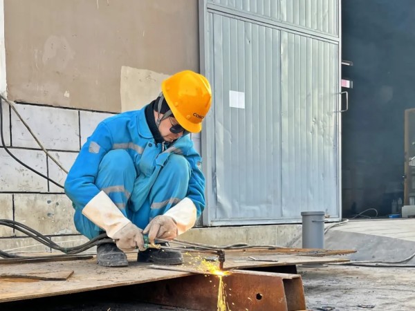 卡爾希海螺維修工貝克正在進(jìn)行鋼材下料作業(yè),他說:“Payvandchi qo‘lidagi yong‘in – uskunaning barqaror ishlashining kafolati.(用我手中的焊槍,保障設(shè)備穩(wěn)定運(yùn)行)
