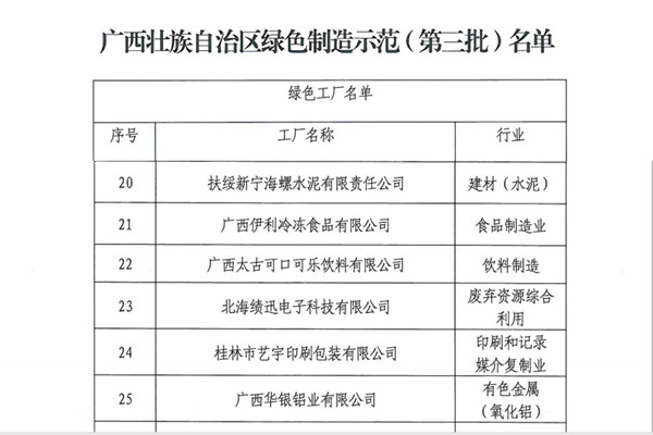 近日,廣西自治區(qū)工業(yè)信息化廳發(fā)布廣西第三批綠色工廠名單,扶綏新寧海螺水泥有限責(zé)任公司榜上有名,榮獲“自治區(qū)級綠色工廠”榮譽稱號。