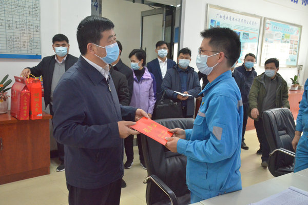 最后,方副主席向凌云通鴻公司春節(jié)期間堅(jiān)守崗位的員工代表送上慰問金和慰問禮包。