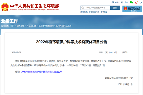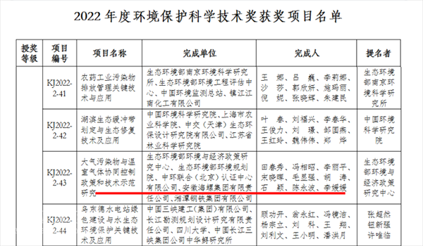 ●《大氣污染物與溫室氣體協(xié)同控制政策和技術(shù)示范研究》獲評2022年度環(huán)境保護科學(xué)技術(shù)獎二等獎