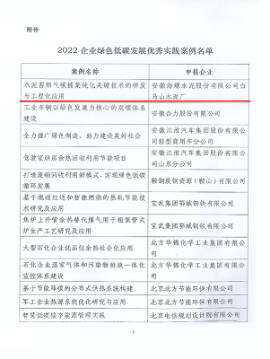 2022年12月,中國企業(yè)聯(lián)合會、中國企業(yè)家協(xié)會發(fā)布《關(guān)于發(fā)布“2022企業(yè)綠色低碳發(fā)展優(yōu)秀實踐案例”的通知》《關(guān)于入選“2022企業(yè)綠色低碳發(fā)展優(yōu)秀實踐案例”的告知函》。集團公司牽頭組織白馬山水泥廠《水泥窯煙氣碳捕集純化關(guān)鍵技術(shù)的研發(fā)與工程化應(yīng)用》、全椒海螺《水泥生產(chǎn)全流程智能制造關(guān)鍵技術(shù)》均獲選“優(yōu)秀實踐案例”。