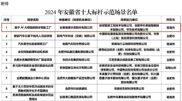 2025年6月9日,省科學(xué)技術(shù)廳發(fā)布2024年度安徽省十大標(biāo)桿示范場景。由海螺水泥打造的“基于 AI 大模型的數(shù)字智能工廠”場景入選其中。