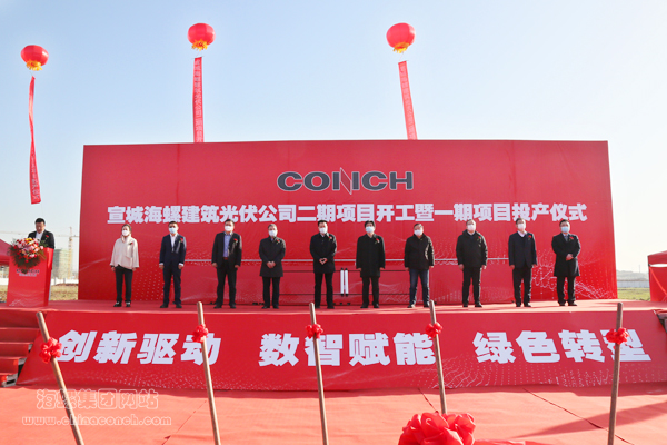 2022年12月15日,宣城海螺建筑光伏公司二期項目開工暨一期項目投產(chǎn)儀式在宣城舉行。宣城市委書記孔曉宏,市委副書記、市長何淳寬,海螺集團黨委書記、董事長楊軍出席儀式。宣城市政府秘書長鄭華、市委副秘書長李壽生、經(jīng)開區(qū)黨工委書記黎斌,海螺水泥總經(jīng)理李群峰,海螺環(huán)??偨?jīng)理李曉波,海螺新能源總經(jīng)理馬偉,股東代表褚衍玲、徐曉華,以及宣城市直有關(guān)單位和經(jīng)開區(qū)負責(zé)人、行業(yè)嘉賓、施工單位代表參加了儀式。