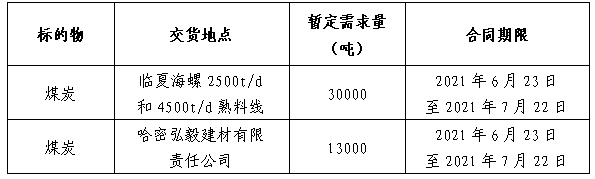 為做好臨夏海螺及哈密弘毅公司7月份煤炭采購(gòu)工作,滿足生產(chǎn)需要,本著“公開、公平、公正”的原則,擬對(duì)煤炭供貨進(jìn)行公開招標(biāo),現(xiàn)將招標(biāo)采購(gòu)信息發(fā)布如下: