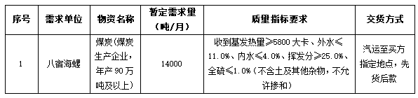 為進(jìn)一步提升煤炭采購(gòu)招標(biāo)的公平、公正、公開(kāi)透明性,根據(jù)海螺水泥八宿海螺煤炭需求情況,現(xiàn)擬組織開(kāi)展八宿海螺2021年度直供煤炭采購(gòu)招標(biāo),特將招標(biāo)事宜公告如下: