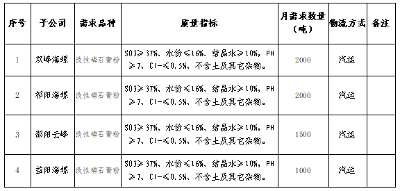 根據(jù)海螺水泥相關(guān)子公司(益陽海螺、邵陽云峰、祁陽海螺、雙峰海螺)2021年8月-2021年12月磷石膏需求,擬對磷石膏采購進(jìn)行公開招標(biāo),選定中標(biāo)人,為體現(xiàn)公平、公正、公開的原則,拓寬采購渠道,現(xiàn)通過海螺物資陽光采購平臺(登陸網(wǎng)址:ygcg.conch.cn)進(jìn)行公開招標(biāo)。招標(biāo)相關(guān)事宜公告如下: