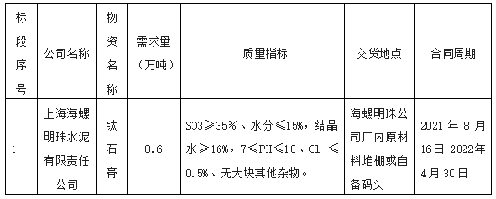 為規(guī)范原材料采購(gòu)業(yè)務(wù),有效降低石膏采購(gòu)成本,根據(jù)公司管理要求,上海海螺明珠水泥有限責(zé)任公司擬開(kāi)展鈦石膏采購(gòu)招標(biāo)工作,為進(jìn)一步體現(xiàn)公平、公正、公開(kāi)的原則,拓寬渠道,現(xiàn)將招標(biāo)相關(guān)信息公告如下: