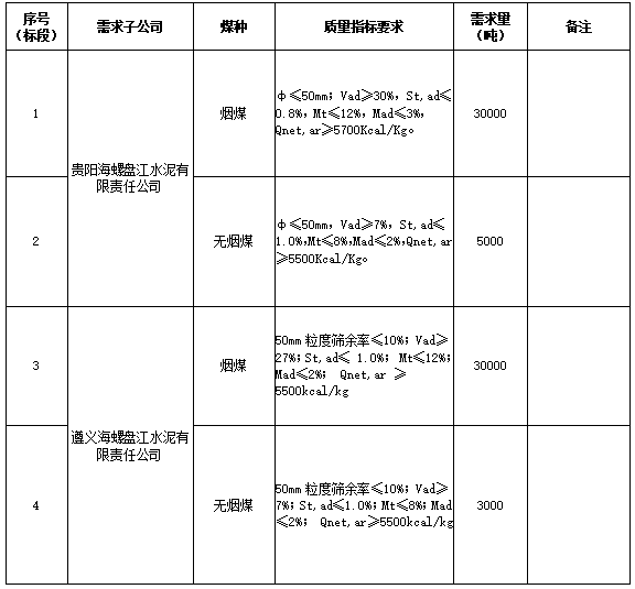 海螺水泥貴州區(qū)域擬對2021年8月21日至2021年9月20日生產(chǎn)用煤炭進(jìn)行公開招標(biāo),選定中標(biāo)單位,現(xiàn)將相關(guān)招標(biāo)事宜公示如下: