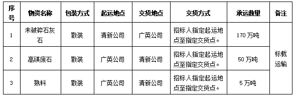 根據(jù)生產(chǎn)用料需要,廣東清新水泥有限公司及廣東清遠(yuǎn)廣英水泥有限公司擬對(duì)兩公司間石灰石、石粉、熟料等原材料運(yùn)輸業(yè)務(wù)面向社會(huì)公開招標(biāo),本著“公開、公平、公正”的競(jìng)爭(zhēng)原則,選擇具備經(jīng)營(yíng)能力較好、運(yùn)輸資質(zhì)合格、保供和服務(wù)能力強(qiáng)的運(yùn)輸保供單位,歡迎具備條件的運(yùn)輸單位參加,現(xiàn)將有關(guān)事項(xiàng)公示如下: