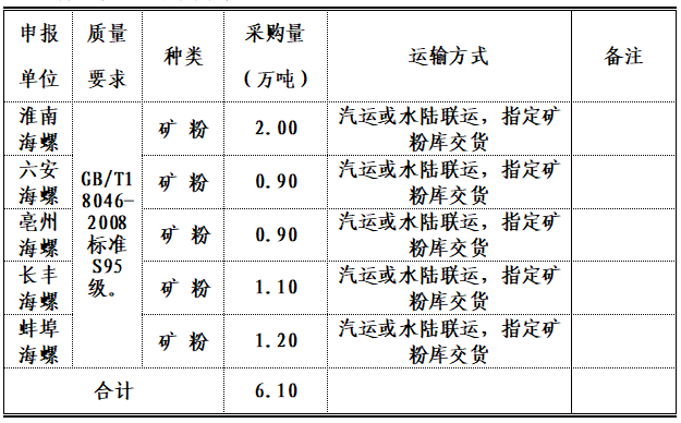 2.交貨地點(diǎn):淮南海螺、六安海螺、亳州海螺、長(zhǎng)豐海螺、蚌埠海螺五家公司指定礦粉庫(kù)。