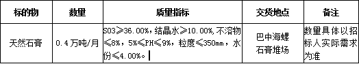 根據(jù)巴中海螺生產(chǎn)經(jīng)營需求,現(xiàn)對(duì)天然石膏采購業(yè)務(wù)進(jìn)行公開招標(biāo),為體現(xiàn)公平、公正、公開、透明的原則,現(xiàn)將招標(biāo)相關(guān)事宜公告如下: