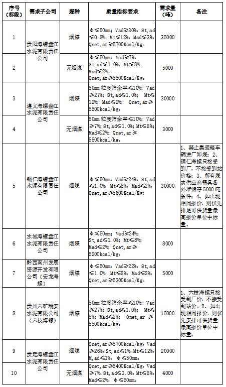 海螺水泥貴州區(qū)域擬對2021年9月21日至2021年10月20日生產(chǎn)用煤炭進(jìn)行公開招標(biāo),選定中標(biāo)單位,現(xiàn)將相關(guān)招標(biāo)事宜公示如下: