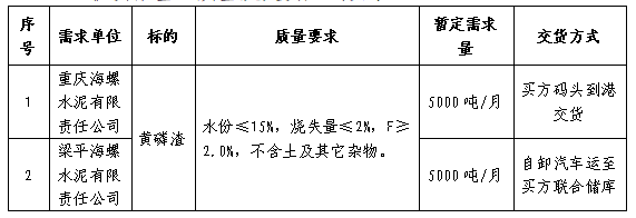 為進(jìn)一步提升黃磷渣采購招標(biāo)的公平、公正、公開透明性,根據(jù)重慶、梁平海螺黃磷渣需求,現(xiàn)組織開展黃磷渣采購招標(biāo),特將招標(biāo)事宜公告如下: