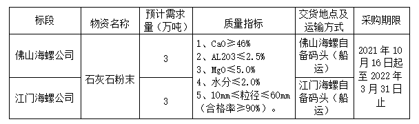 安徽海螺水泥股份有限公司廣東區(qū)域下屬的佛山、江門、海螺兩家家公司擬聯(lián)合開展石灰石粉末公開招標工作,為進一步體現(xiàn)公平、公正、公開的原則,拓寬采購渠道,提高采購質(zhì)量,現(xiàn)將相關(guān)事宜公告如下: