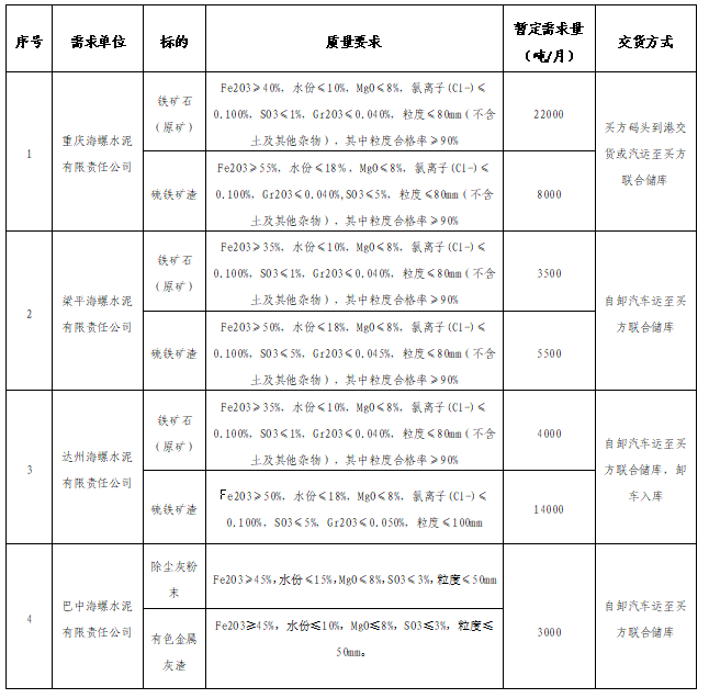 備注:1.投標(biāo)渠道可根據(jù)自有資源填報(bào)實(shí)際品位,達(dá)州海螺、梁平海螺原則上鐵礦石(原礦)Fe2O3不低于35%、硫鐵礦渣Fe2O3不低于50%;重慶海螺原則上鐵礦石(原礦)Fe2O3不低于40%、硫鐵礦渣Fe2O3不低于55%;巴中海螺除塵灰粉末或有色金屬灰渣Fe2O3不低于45%。品位以5%為基準(zhǔn)遞增,最終均以單鐵干基性價(jià)比最優(yōu)確定擬中標(biāo)單位。