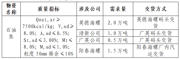 根據(jù)公司需求,擬對(duì)英德海螺、清新、廣英、陽(yáng)春公司所需石油焦進(jìn)行招標(biāo),為進(jìn)一步體現(xiàn)公平、公正、公開的原則,現(xiàn)將招標(biāo)采購(gòu)信息發(fā)布如下: