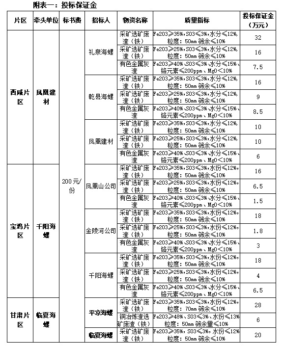 根據(jù)2022年度禮泉海螺、平?jīng)龊B?、千陽海螺、乾縣海螺、臨夏海螺、鳳凰建材、金陵河公司、鳳凰山公司等8家公司生產(chǎn)經(jīng)營計劃,現(xiàn)對2022年度鐵質(zhì)材料(直供)采購組織招標,為進一步體現(xiàn)公平、公正、公開透明的原則,此次招標將在安徽海螺水泥股份有限公司陽光采購平臺公開進行,現(xiàn)將招標采購信息發(fā)布如下: