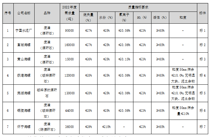 根據(jù)2022年度安徽海螺水泥股份有限公司寧國水泥廠(以下簡稱:寧國水泥廠)、安徽宣城海螺水泥有限公司(以下簡稱:宣城海螺)、黃山海螺水泥有限責任公司(以下簡稱;黃山海螺)、安徽銅陵海螺水泥有限公司(以下簡稱:銅陵海螺)、安徽荻港海螺水泥股份有限公司(以下簡稱:荻港海螺)、蕪湖海螺水泥有限公司(以下簡稱:蕪湖海螺)、安徽懷寧海螺水泥有限公司(以下簡稱:懷寧海螺)生產(chǎn)需求,對水泥生產(chǎn)配料用煤矸石采購進行聯(lián)合公開招標,為體現(xiàn)公平、公正、公開的原則,同時為拓寬采購渠道,提高采購質(zhì)量,現(xiàn)將招標相關(guān)事宜公告如下: