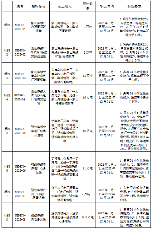 2、本次招標(biāo)活動(dòng)要求投標(biāo)單位具有24小時(shí)運(yùn)輸保供能力,在以往運(yùn)輸過程中無(wú)不良記錄。投標(biāo)運(yùn)輸單位必須列出用于標(biāo)的原材料品種運(yùn)輸?shù)能囕v明細(xì)及載重噸位,且投標(biāo)單位列出的運(yùn)輸車輛不得與其他投標(biāo)單位重復(fù),招標(biāo)人有權(quán)要求投標(biāo)單位對(duì)其填報(bào)的運(yùn)輸工具事實(shí)予以進(jìn)一步澄清,否則取消其投標(biāo)資格。