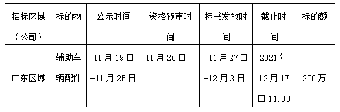 廣東區(qū)域擬對(duì)2022年度輔助車輛配件項(xiàng)目進(jìn)行公開招標(biāo),為進(jìn)一步體現(xiàn)公平、公正、公開的原則,拓寬采購(gòu)渠道,提高招標(biāo)質(zhì)量,現(xiàn)將相關(guān)事宜公告如下: