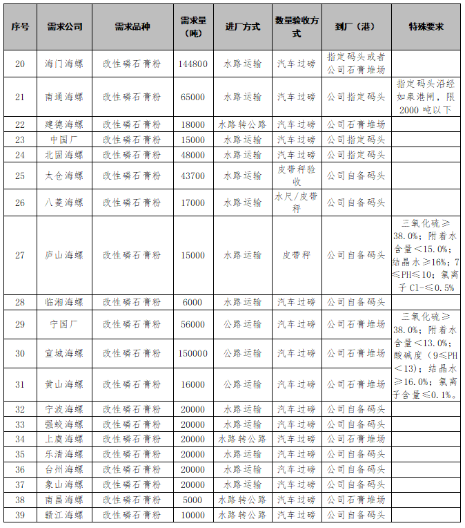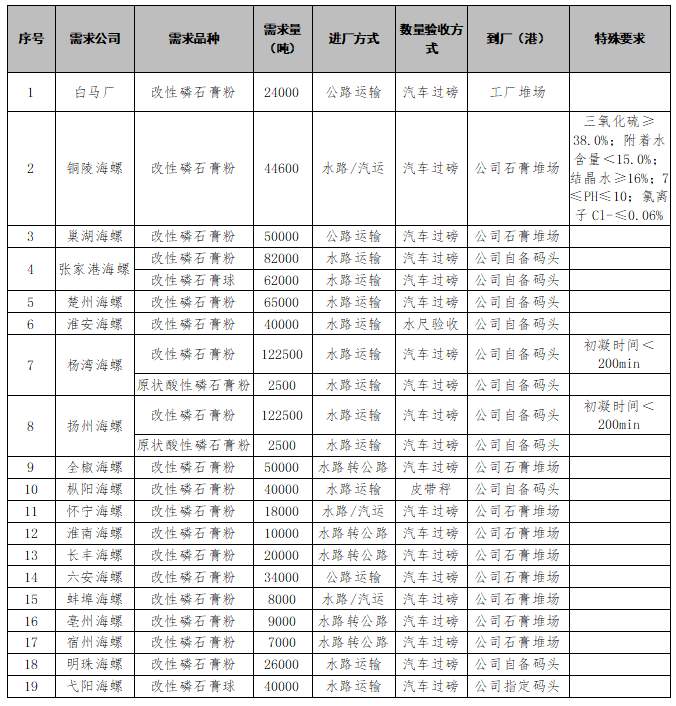 根據(jù)海螺水泥各公司生產(chǎn)經(jīng)營(yíng)計(jì)劃,安徽銅陵海螺水泥有限公司聯(lián)合華東及中部地區(qū)部分公司對(duì)磷石膏進(jìn)行聯(lián)合招標(biāo),為進(jìn)一步體現(xiàn)公平、公正、公開(kāi)的原則,拓寬采購(gòu)渠道,提高采購(gòu)質(zhì)量,現(xiàn)將招標(biāo)采購(gòu)信息發(fā)布如下: