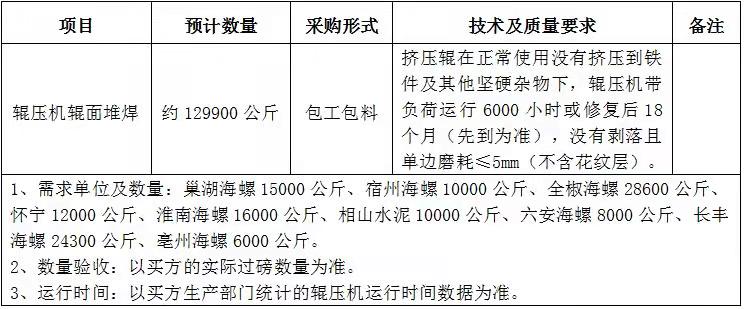 根據(jù)生產(chǎn)經(jīng)營需求,本著“公開、公平、公正、誠實信用和競爭、擇優(yōu)”原則,海螺水泥皖北區(qū)域下屬宿州海螺、全椒海螺、巢湖海螺、懷寧海螺、淮北相山、淮南海螺、六安海螺、長豐海螺、亳州海螺等九家公司擬聯(lián)合開展2021年皖北區(qū)域輥壓機輥面堆焊包工包料業(yè)務(wù)公開招標(biāo),歡迎具備條件的單位參加,現(xiàn)將招標(biāo)相關(guān)事項公示如下: