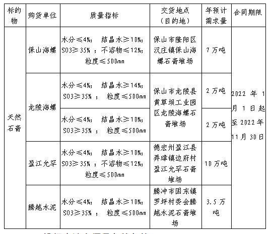 云南區(qū)域云西片區(qū)海螺公司擬對2022年度天然石膏進(jìn)行招標(biāo)采購,選定中標(biāo)人。本次招標(biāo)由云南區(qū)域保山海螺水泥有限責(zé)任公司負(fù)責(zé)組織實(shí)施。為體現(xiàn)公平、公正、公開的原則,拓寬采購渠道,通過網(wǎng)上海螺物資陽光采購平臺(tái)(網(wǎng)址http://ygcg.conch.cn)進(jìn)行公開招標(biāo),現(xiàn)將相關(guān)事宜公示如下: