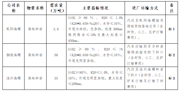 根據(jù)池州、銅陵和樅陽海螺公司實際生產(chǎn)需求,本著“公開、公平、公正”的原則,擬對直供高硅砂巖進行公開招標,歡迎具備條件的單位參加,現(xiàn)將招標相關(guān)事宜公告如下:
