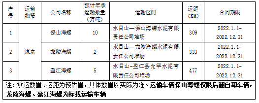 盈江海螺擬對(duì)云西片區(qū)2022年度水目山站原煤短倒運(yùn)輸進(jìn)行公開(kāi)招標(biāo),選定中標(biāo)單位,現(xiàn)將相關(guān)事宜公示如下: