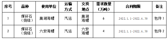 巢湖海螺水泥有限責(zé)任公司、六安海螺水泥有限責(zé)任公司擬對(duì)2022年上半年煤矸石(燒結(jié))采購(gòu)進(jìn)行公開招標(biāo),選定中標(biāo)人。現(xiàn)將相關(guān)事宜公告如下: