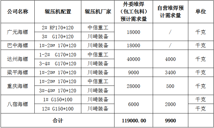 根據(jù)2022-2023年度水泥磨輥壓機(jī)輥面堆焊及日常花紋層修補(bǔ)需求,海螺水泥川渝區(qū)域各子公司擬對(duì)輥壓機(jī)維修用耐磨焊絲進(jìn)行招標(biāo),為進(jìn)一步體現(xiàn)公開(kāi)、公平、公正、擇優(yōu)的原則,拓寬采購(gòu)渠道,保證采購(gòu)質(zhì)量,現(xiàn)將招標(biāo)相關(guān)信息公告如下: