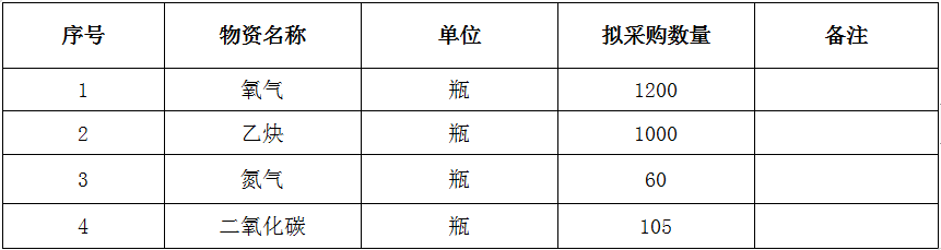 1.招標物資名稱:工業(yè)氣體(氧氣、乙炔、氮氣、二氧化碳)。