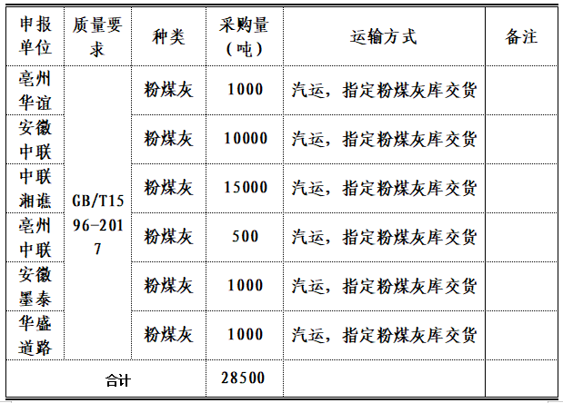 亳州華誼、安徽中聯(lián)、中聯(lián)湘譙、亳州中聯(lián)、安徽墨泰和華盛道路粉煤灰合同將于2021年12月31日到期。為保證合同到期后粉煤灰供貨的有序銜接,根據(jù)《物資采購招標(biāo)管理辦法》和《物資采購招標(biāo)實施細(xì)則》相關(guān)制度要求,擬采取公開招標(biāo)方式實施,選定中標(biāo)人?,F(xiàn)將相關(guān)事宜公告如下: