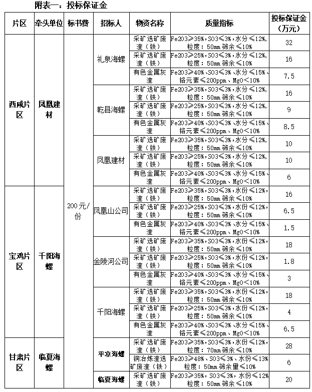 投標(biāo)申請(qǐng)人需承擔(dān)與遞交投標(biāo)文件有關(guān)的費(fèi)用,投標(biāo)申請(qǐng)人在領(lǐng)取標(biāo)書前,應(yīng)以投標(biāo)公司名義和銀行轉(zhuǎn)賬方式交納貳佰元標(biāo)書費(fèi),投標(biāo)人應(yīng)在投遞標(biāo)書之前以投標(biāo)公司名義和銀行轉(zhuǎn)賬方式繳納投標(biāo)保證金(具體費(fèi)用如表中所示),待招標(biāo)結(jié)束后,未中標(biāo)單位交納的投標(biāo)保證金待開標(biāo)后由鳳凰建材公司在10個(gè)工作日內(nèi)無(wú)息退還投標(biāo)人,中標(biāo)人的投標(biāo)保證金自動(dòng)轉(zhuǎn)為合同履約保證金,不足部分中標(biāo)人在合同簽訂前以電匯方式(不接受個(gè)人轉(zhuǎn)賬)補(bǔ)齊,合同履約保證金在年度合同履行完畢后30日內(nèi)無(wú)息退還。招標(biāo)人不收取任何現(xiàn)金,不接受以個(gè)人賬戶轉(zhuǎn)賬。