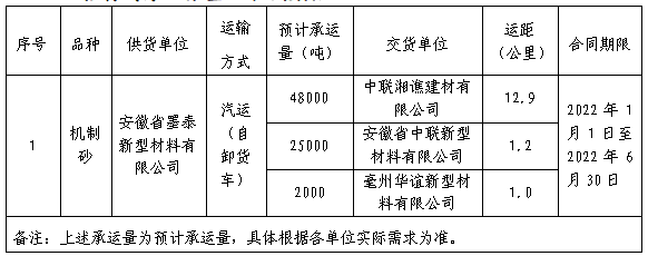 2022年上半年安徽墨泰至安徽中聯(lián)、亳州華誼和中聯(lián)湘譙的機制砂短倒運輸進行招標,現(xiàn)將本次招投標的有關(guān)事宜公告如下: