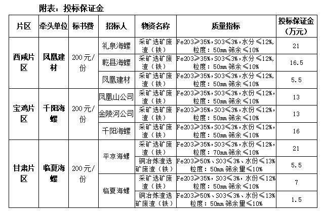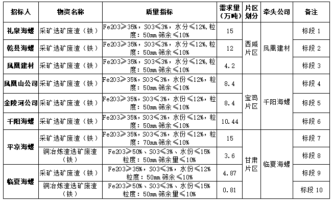 7.本次招標(biāo)要求投標(biāo)人須具有較強(qiáng)的保供能力及符合招標(biāo)質(zhì)量要求的資源(其中禮泉海螺、平?jīng)龊B?、乾縣海螺、千陽(yáng)海螺采礦選礦廢渣(鐵)投標(biāo)單位月度可供量不得少于5000噸;金陵河公司、鳳凰山公司、鳳凰建材公司、臨夏海螺的采礦選礦廢渣(鐵)投標(biāo)單位月度可供量不得少于3000噸;平?jīng)龊B葶~冶煉渣選礦廢渣(鐵)投標(biāo)單位月度可供量不得少于2000噸)。