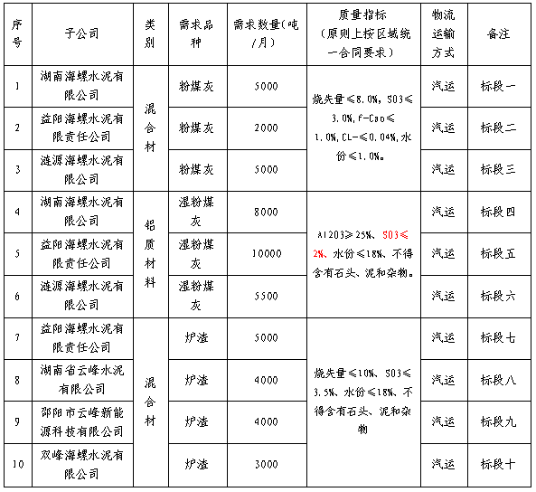 根據(jù)湖南、漣源、雙峰、益陽海螺、湖南云峰和邵陽云峰六家公司2022年3月1日至2022年8月31日電廠廢渣(含粉煤灰、濕粉煤灰、爐渣等)的需求,現(xiàn)擬對電廠廢渣進行招標,選定中標人,為體現(xiàn)公平、公正、公開的原則,拓寬采購渠道,現(xiàn)通過海螺物資陽光采購平臺(登陸網(wǎng)址:ygcg.conch.cn)進行公開招標,招標相關(guān)事宜公告如下: