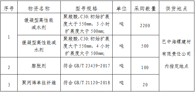 鑒于2022年生產(chǎn)方量大幅提升,為進(jìn)一步提升外加劑采購招標(biāo)的公平、公正、公開透明性,根據(jù)巴中海螺建材(商混)外加劑需求,現(xiàn)組織開展外加劑公開招標(biāo),特將招標(biāo)事宜公告如下: