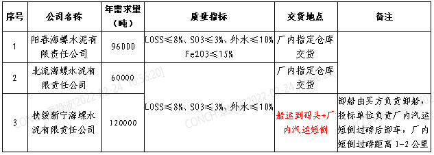 根據(jù)招標(biāo)計劃安排由陽春海螺牽頭開展扶綏海螺、北流海螺和陽春海螺三公司2022-2023年度云浮硅質(zhì)渣(硫鐵礦渣)聯(lián)合招標(biāo)采購工作,為進(jìn)一步體現(xiàn)公平、公正、公開的原則,現(xiàn)將招標(biāo)采購信息發(fā)布如下:
