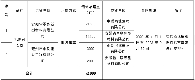 為做好2022年4-9月份安徽墨泰和亳州中聯(lián)機制砂石粉至安徽中聯(lián)、中聯(lián)湘譙短倒運輸招標工作,由安徽海螺綠色新材料有限公司采購部牽頭,對上述線路運輸進行公開招標,特將本次招投標的有關(guān)事宜公告如下: