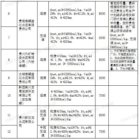 5.若2022年3月21日-2022年4月20日貴州區(qū)域煤炭招標(biāo)報(bào)名單位同為2022年2月21日—2022年3月20日中標(biāo)單位,中標(biāo)單位在執(zhí)行合同供貨量在2022年3月6日24時(shí)前(銷發(fā)系統(tǒng)進(jìn)廠數(shù)量)小于合同約定量的30%的,不予以參與海螺水泥貴州區(qū)域2022年3月21日至2022年4月20日煤炭招標(biāo)(僅買方原因或不可抗力因素除外,鐵路在途和在站煤炭不給予納入供貨量,僅以進(jìn)廠數(shù)量為準(zhǔn)),并取消在貴州區(qū)域所有海螺6個(gè)月內(nèi)的投標(biāo)資格。