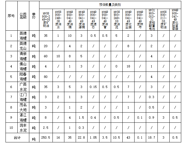 為做好廣東區(qū)域英德海螺水泥有限責(zé)任公司(以下簡(jiǎn)稱英德海螺)、廣東清新水泥有限公司(以下簡(jiǎn)稱清新海螺)、江門海螺水泥有限公司(以下簡(jiǎn)稱江門海螺)、湛江海螺水泥有限責(zé)任公司(以下簡(jiǎn)稱湛江海螺)、佛山海螺水泥有限責(zé)任公司(以下簡(jiǎn)稱佛山海螺)、茂名市大地水泥有限公司(以下簡(jiǎn)稱茂名大地)、陽(yáng)春海螺水泥有限責(zé)任公司(以下簡(jiǎn)稱陽(yáng)春海螺)、廣東清遠(yuǎn)廣英水泥有限公司(以下簡(jiǎn)稱廣英水泥)、廣東海螺鴻豐水泥有限公司(以下簡(jiǎn)稱鴻豐水泥)以及英德龍山水泥有限責(zé)任公司(以下簡(jiǎn)稱英德龍山)2022-2023年危廢處置工作,防范環(huán)?;轱L(fēng)險(xiǎn),本次由江門海螺牽頭對(duì)以上10家公司危廢物資處置進(jìn)行公開(kāi)招標(biāo),歡迎具備條件的單位參加。現(xiàn)將招標(biāo)基本信息發(fā)布如下: