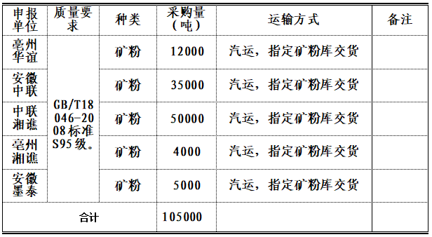 3.2022年4月至12月份礦粉計(jì)劃采購(gòu)量10.5萬(wàn)噸,具體如下: