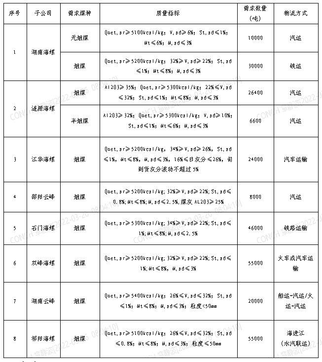 根據(jù)2022年4月21日-2022年5月20日海螺水泥湖南區(qū)域各子公司煤炭需求,現(xiàn)擬對(duì)煤炭進(jìn)行公開招標(biāo),選定中標(biāo)人,為體現(xiàn)公平、公正、公開的原則,拓寬采購渠道,現(xiàn)將招標(biāo)相關(guān)事宜公告如下: