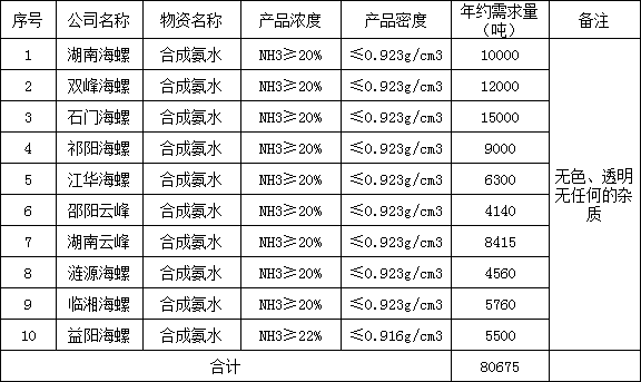 1、標(biāo)的內(nèi)容:合成氨水NH3≥20%、密度≤ 0.923g/cm3(其中益陽(yáng)海螺合成氨水NH3≥22%、、密度≤ 0.916g/cm3),產(chǎn)品質(zhì)量應(yīng)符合國(guó)家工業(yè)氨水標(biāo)準(zhǔn)HG1-88-81《氨水》;