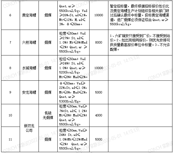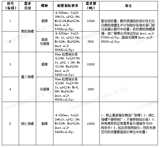 海螺水泥貴州區(qū)域擬對2022年5月21日至2022年6月20日生產(chǎn)用煤炭進(jìn)行公開招標(biāo),選定中標(biāo)單位,現(xiàn)將相關(guān)招標(biāo)事宜公示如下: