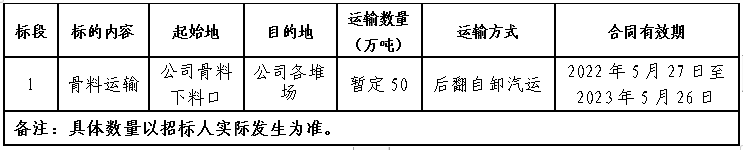(二)2022年5月18日9:00至2022年5月21日9:00在禮泉海螺物資陽光采購平臺發(fā)布骨料運輸招標公告,同步在禮泉海螺公司大門、開票大廳、直供電廠及礦點等發(fā)布招標公告,同時在當?shù)刂饕獔笊邕M行公告,并接受報名;